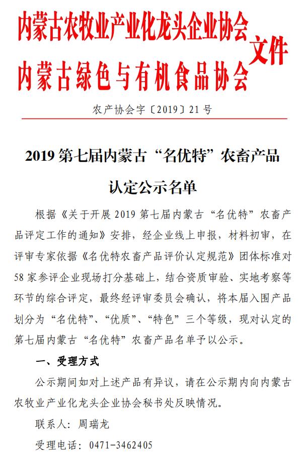 標題:2019第七屆內(nèi)蒙古“名優(yōu)特”農(nóng)畜產(chǎn)品認定公示名單